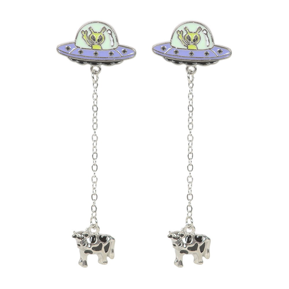 These glow in the dark alien abduction dangle earrings are utterly out of this world. Featuring a classic UFO mid-beam with an unsuspecting cow along for the ride, they're the perfect accessory for fans of the strange, the funny, and the extraterrestrial. May contain traces of nickel and is made from alloy in accordance to REACH specification. Designed by Something Different Wholesale and part of the Camp Cryptid collection of alien and paranormal gifts and home decor.
