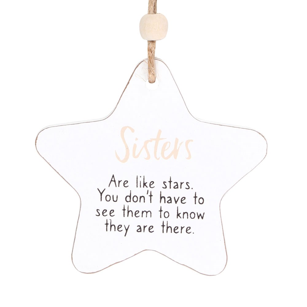 A small star sign perfect for birthdays and other special occasions. Features text that reads, 'Sisters are like stars. You don't have to see them to know they are there' and finished with a wooden bead. Designed by Something Different Wholesale and part of the Hanging Sentiment Sign range.