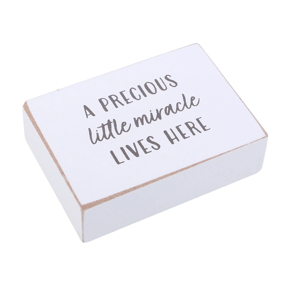 Celebrate life s most special moments with this Wooden Motto Plaque in a Hessian Bag. Featuring the heartfelt wording A Precious Little Miracle Lives Here on a white wooden plaque, it makes a thoughtful keepsake for new arrivals and growing families. Each plaque comes neatly presented inside a rustic hessian drawstring bag, tied for a charming country style finish. Ideal for gifting at baby showers, christenings or as a sweet addition to nursery d cor. Priced per piece and sold in multiples of 12.