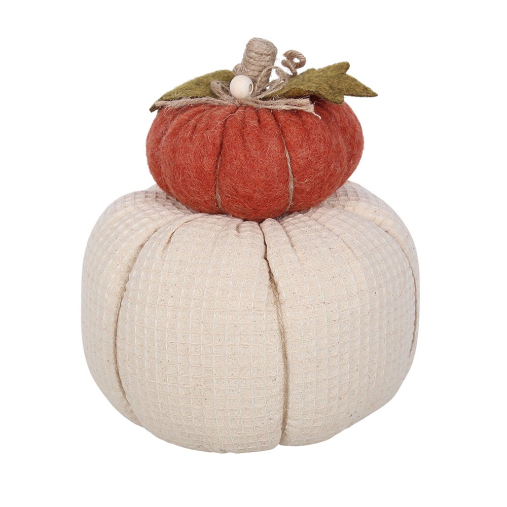 Bring layered texture to your seasonal d cor with this stacked fabric pumpkin decoration. Featuring a large cream pumpkin as the base with a traditional orange pumpkin stacked on top, it creates a charming double layered look that stands out on shelves, tables or mantelpieces. The warm autumnal colour palette complements a range of interior styles, from modern and contemporary to classic country homes. Perfect for autumn displays, harvest d cor or adding a cosy finishing touch to your home.