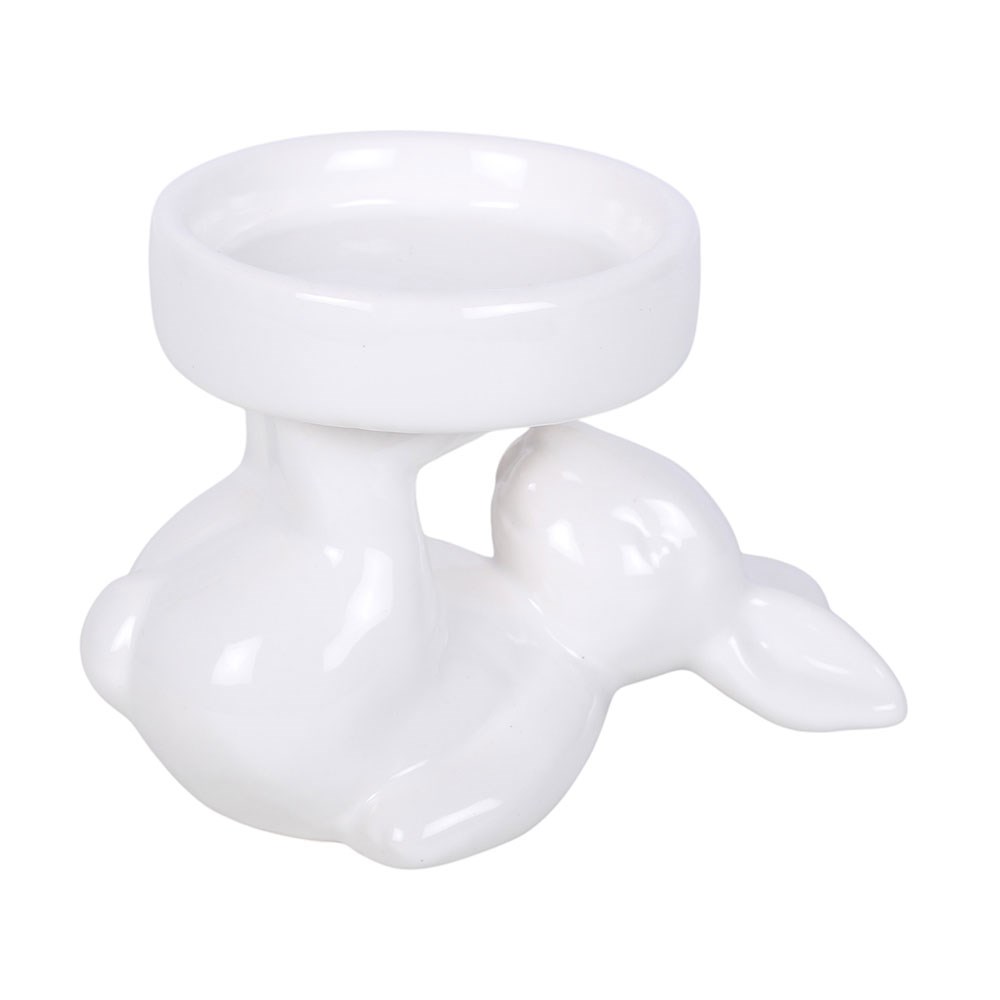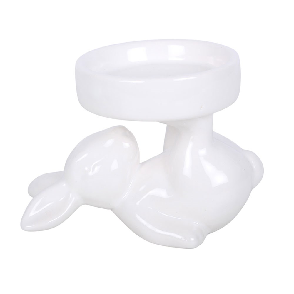 Add a playful touch to your décor with this versatile bunny display stand. Featuring an adorable white ceramic bunny rabbit lying on its back with its feet raised, it supports a small plate above that is perfect for holding a cupcake, tealight or small candle. Ideal for afternoon tea settings, spring displays or Easter décor, it offers a fun and eye catching way to present sweet treats or soft candlelight. A lovely gift for rabbit lovers and those who enjoy quirky home accessories.