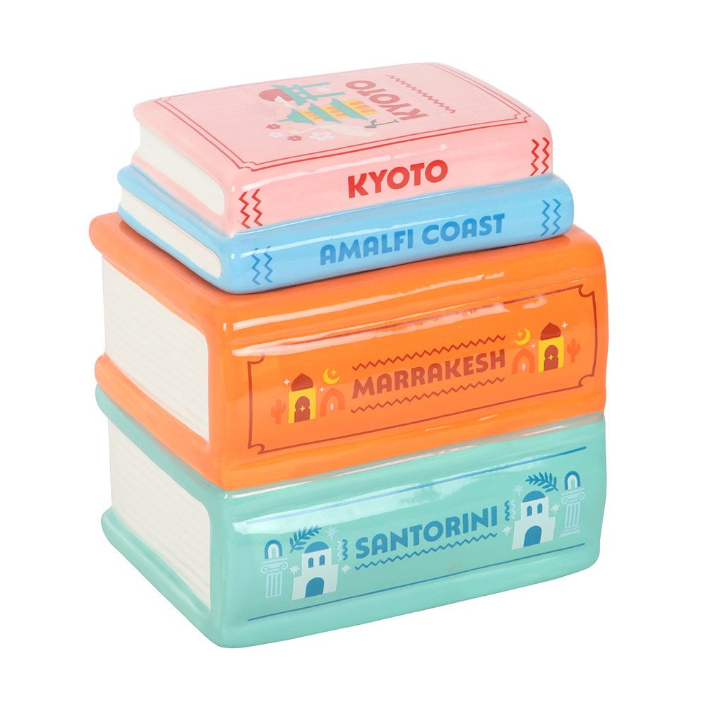 Take your senses on a first-class journey with this colourful book stack oil burner and wax warmer shaped like an inspiring collection of travel guides. Makes a thoughtful gift for globetrotters looking to add memories of their adventures to their home fragrance routine. Always remove the lid whilst in use. Simply place a single standard tealight in the space at the back and add a few drops of diluted fragrance oil or wax melts in the bowl. Designed by Something Different Wholesale and part of the Scents of Adventure collection of travel-themed home fragrance gifts and home decor.