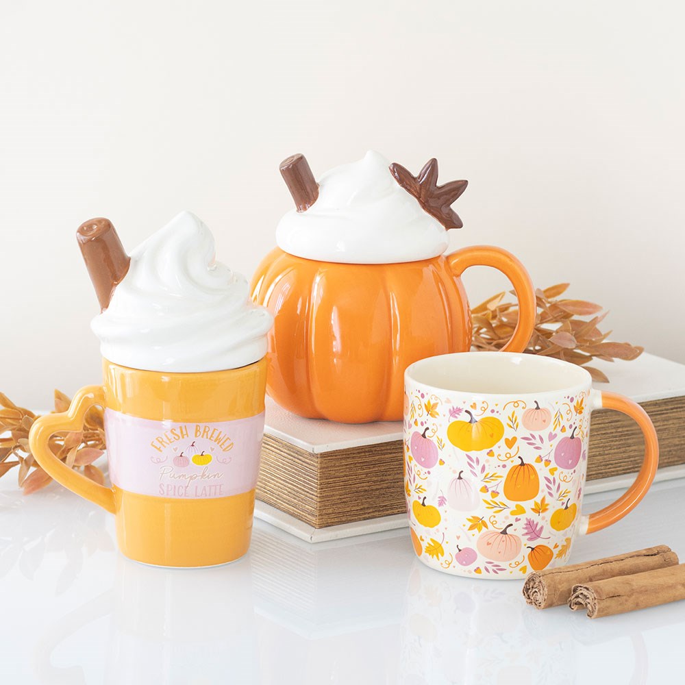 Serve up seasonal drinks with this charming pumpkin-shaped mug complete with a cream-style lid, perfect for keeping beverages warm on crisp autumn days. A delightful gift for fans of seasonal drinks and festive kitchenware, ideal for enjoying hot chocolate, tea or coffee throughout the season. Do not microwave. Hand wash only. Designed by Something Different Wholesale and part of the Pumpkin Pie collection of pink and orange autumn decor and fall giftware.