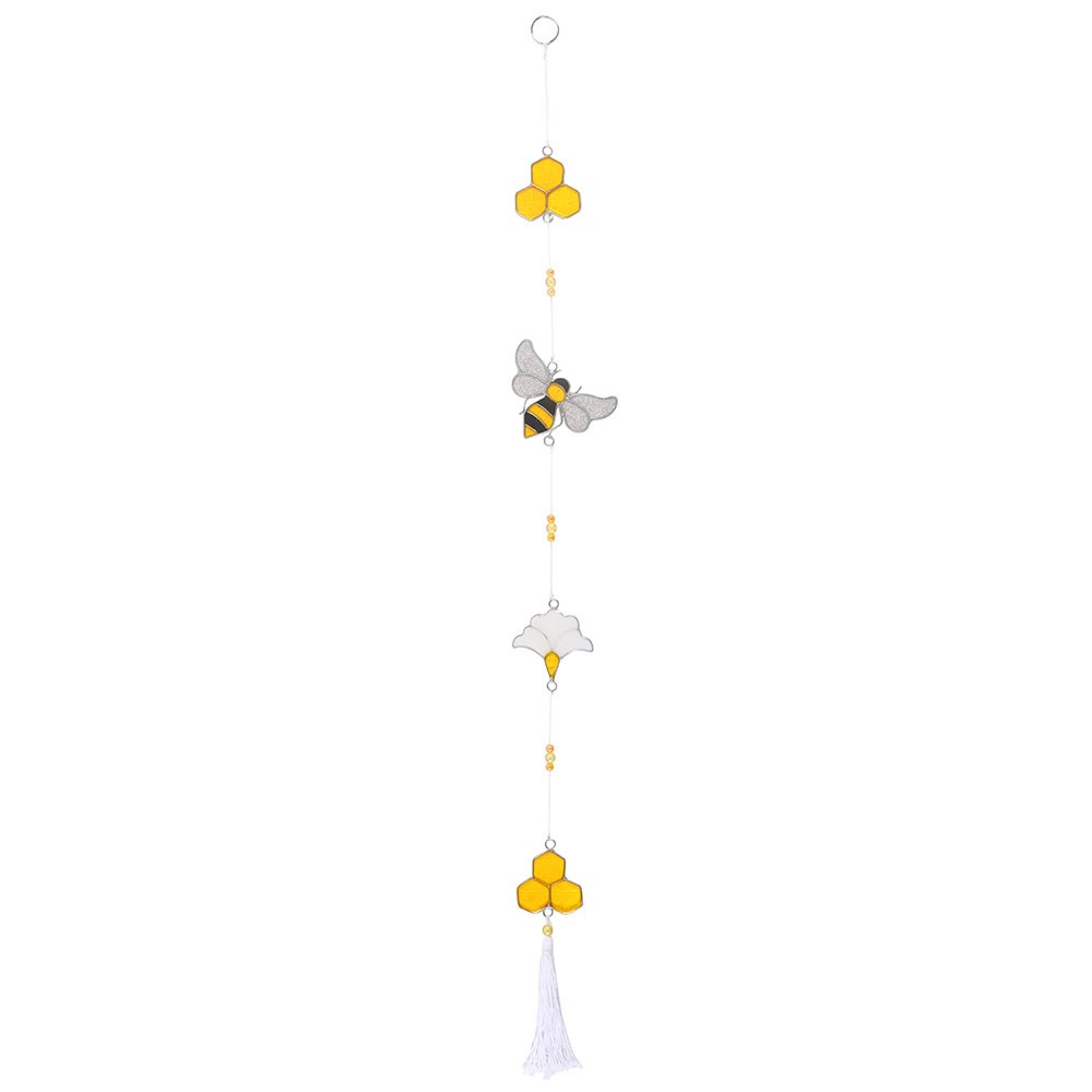 Celebrate the beauty of nature with this sunny string of resin suncatchers featuring a glittering bee, honeycomb cells and flower details. Finished with bright yellow beads and a white tassel, this hanging decoration brings a touch of outdoor charm to any window, balcony or garden nook. Designed by Something Different Wholesale.