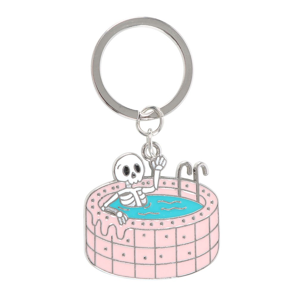 Chilled to the bone. This Dead Cool skeleton enamel keyring features a relaxed skeleton soaking in a pink swimming pool, bringing a tongue-in-cheek edge to your keys or bag. A must-have accessory for fans of playful gothic style with plenty of personality. Designed by Something Different Wholesale and part of the Dead Hot Days collection of gothic summer gifts and accessories.