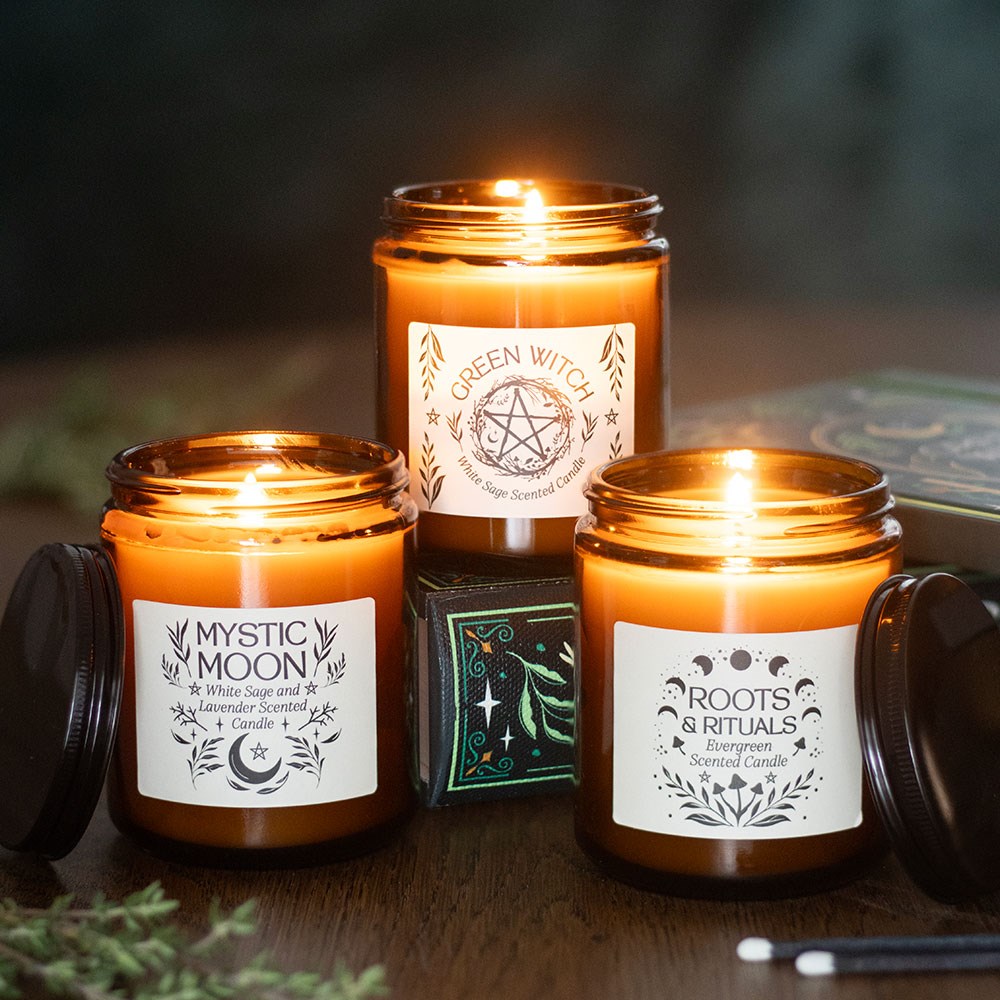 Let calm and clarity flow with the soothing blend of sage and lavender in this Mystic Moon amber glass candle. Ideal for winding down, spiritual practices, or setting a serene tone in the home. Approximately 22-hour burn time. Made from paraffin wax. Never leave a lit candle unattended. Designed by Something Different Wholesale and part of the Green Witch collection of mystical gifts and home decor.