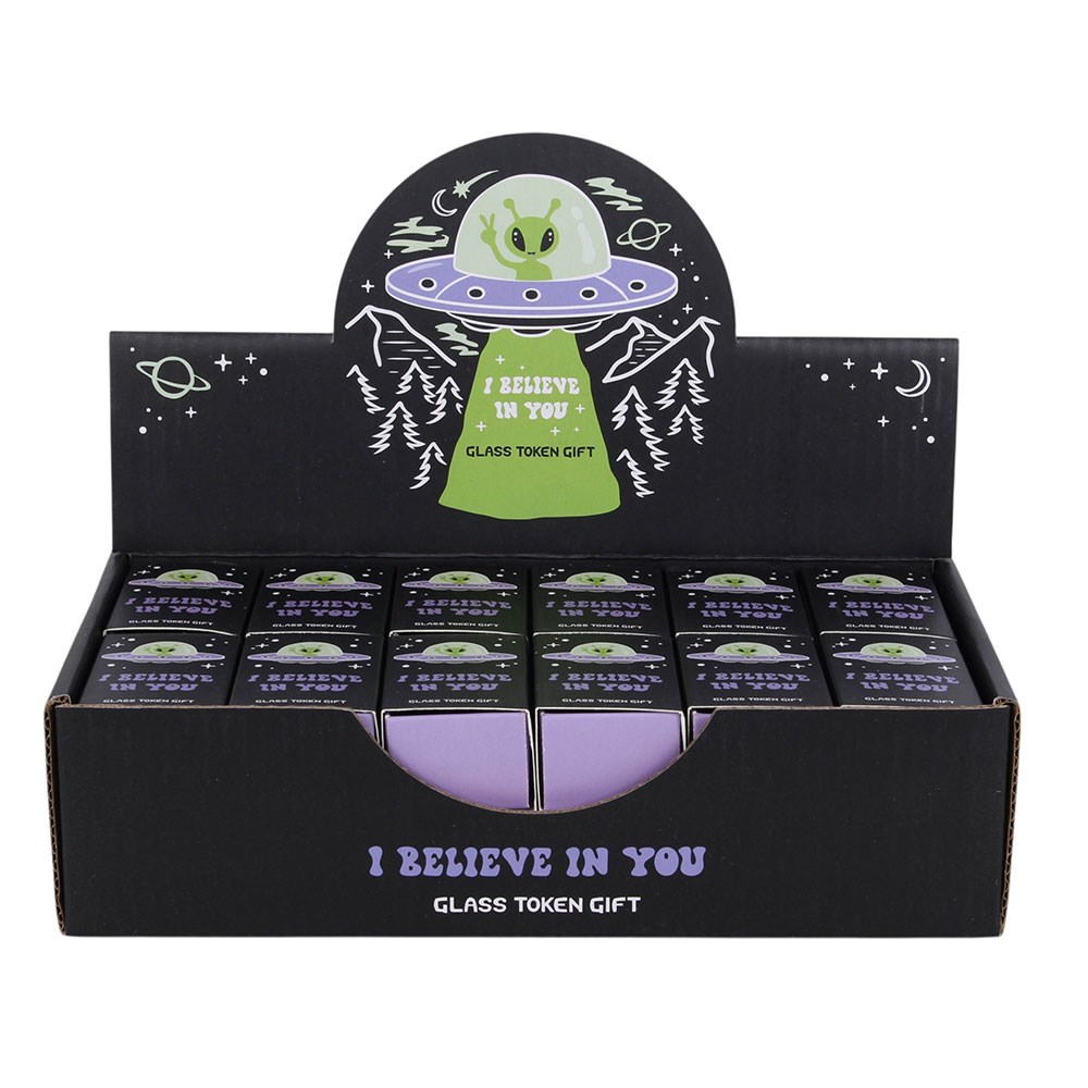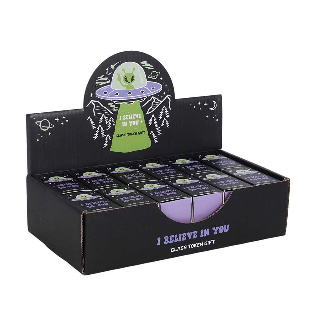 Send a tiny green friend to someone who needs a cosmic pick-me-up with this set of 24 alien token gifts. Each one comes with a sweet "I believe in you" matchbox-style packaging and arrives in a themed cardboard display ready for gift shops, event counters, or UFO landing zones. Sold as a set of 24 in a matching display. Designed by Something Different Wholesale and part of the Camp Cryptid collection of alien and paranormal gifts and home decor.