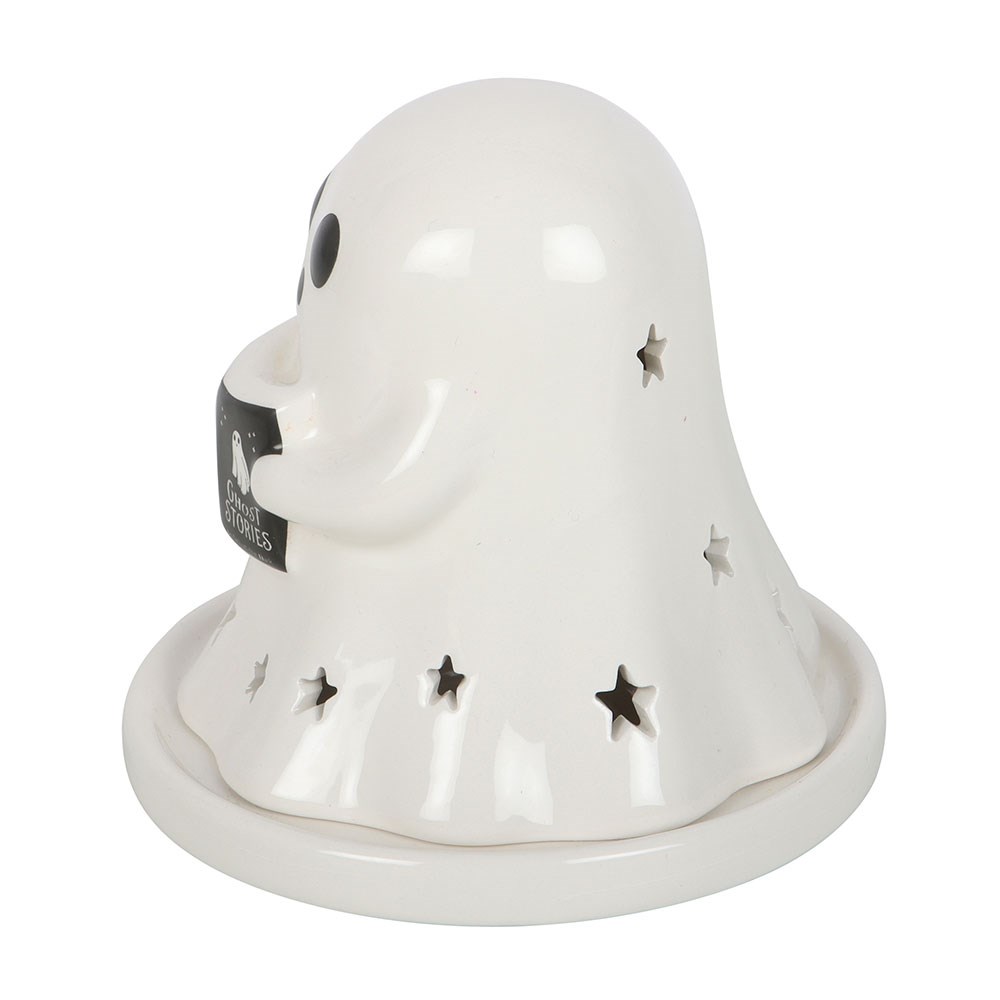 Add a playful, spooky touch to any room with this Ghost Stories tealight candle holder and incense cone holder. Featuring an adorable ghost absorbed in a tiny book of ghostly tales, it can be used to hold your favourite fragrance or light your home with a comforting, candlelit glow. Please practice caution when using and never leave lit incense or candle unattended. Lid may become hot. Let cool before handling. Designed by Something Different Wholesale and part of The Haunted Library collection of spooky bookish gifts and home decor for Halloween and everyday.