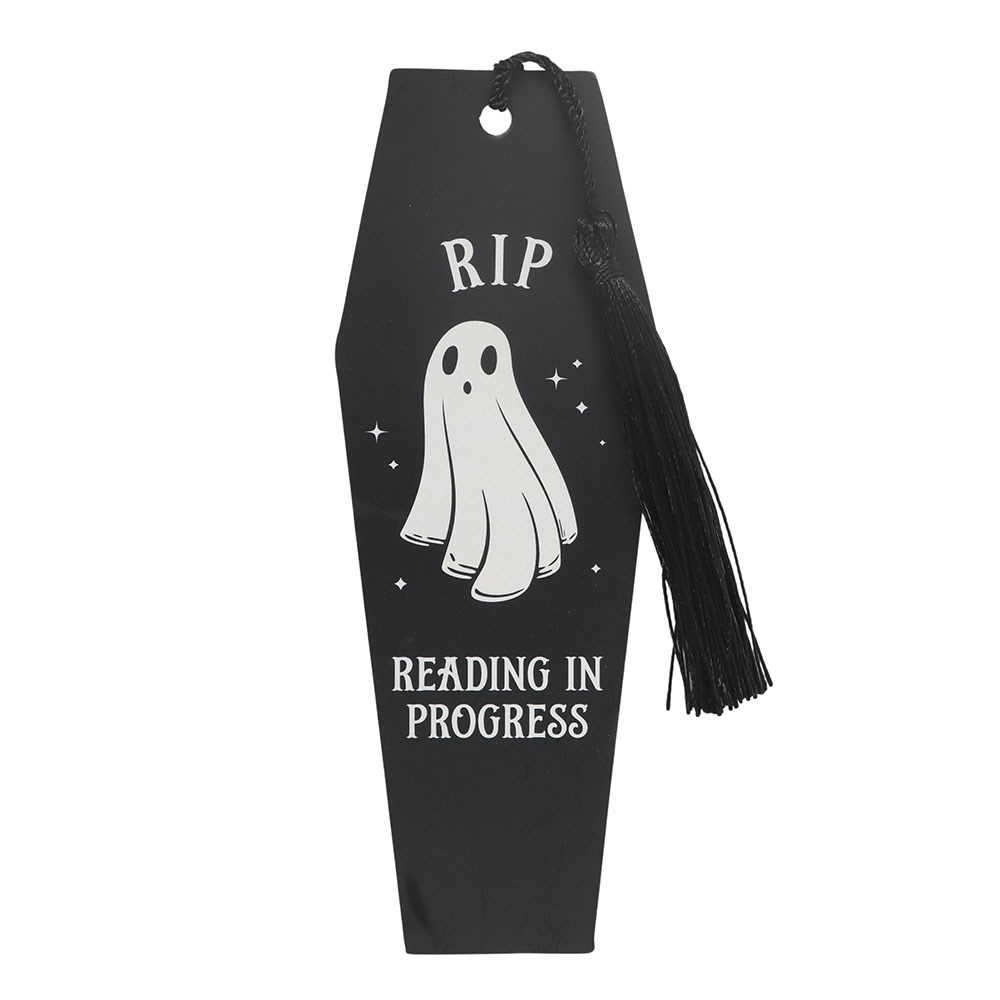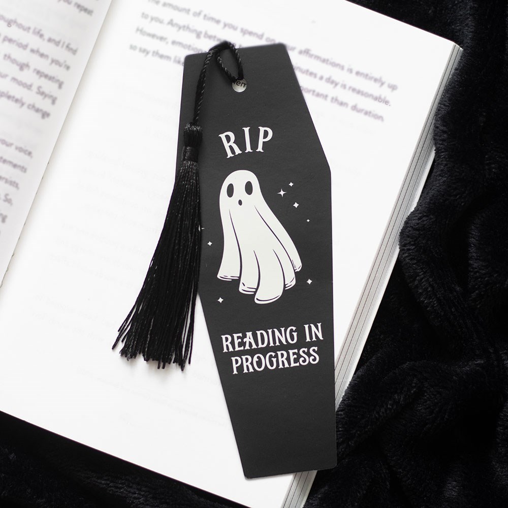 Keep your place in haunting reads with this coffin-shaped bookmark, featuring a sweet ghost design with RIP Reading in Progress text and topped with a black tassel. A fun pick for Halloween or everyday use, its perfect for dark and spooky book lovers. Designed by Something Different Wholesale and part of The Haunted Library collection of spooky bookish gifts and home decor.