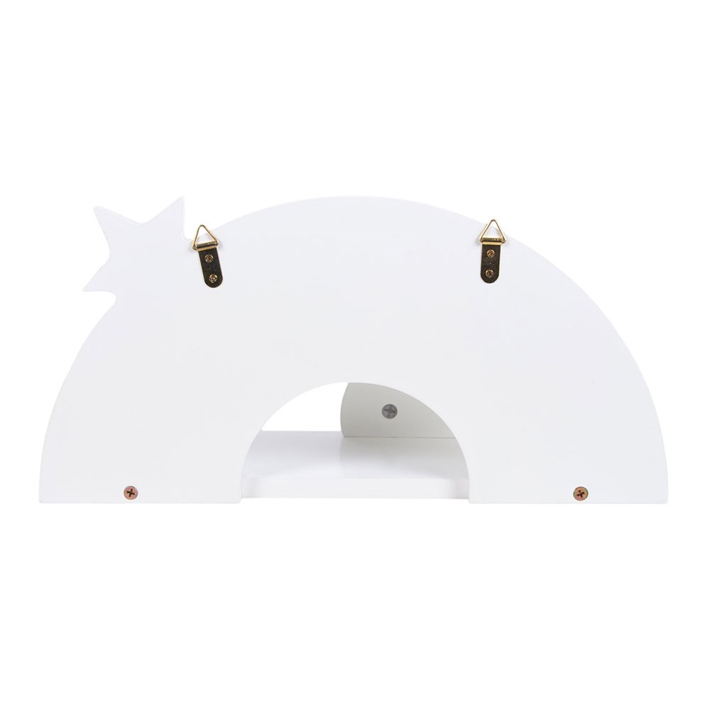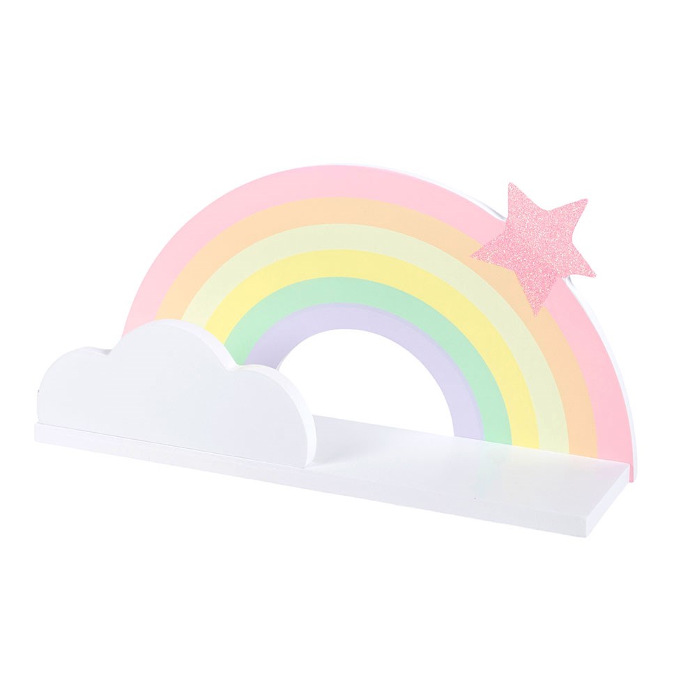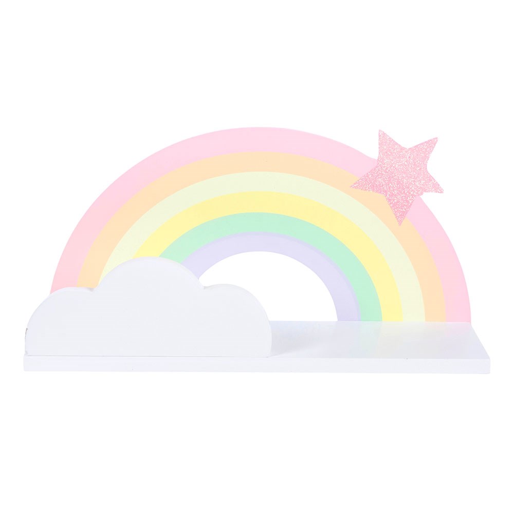 Brighten up any childs room with this wooden rainbow shelf. Designed in the fun shape of a rainbow, it features soft white and pastel colours finished with a sparkling glitter star for an extra special touch. Perfect for displaying favourite books, small toys or keepsakes, it adds both storage and colour to bedrooms or playrooms. Easy to fix to the wall, this cheerful childrens shelf makes a lovely gift and a charming feature for little ones spaces.