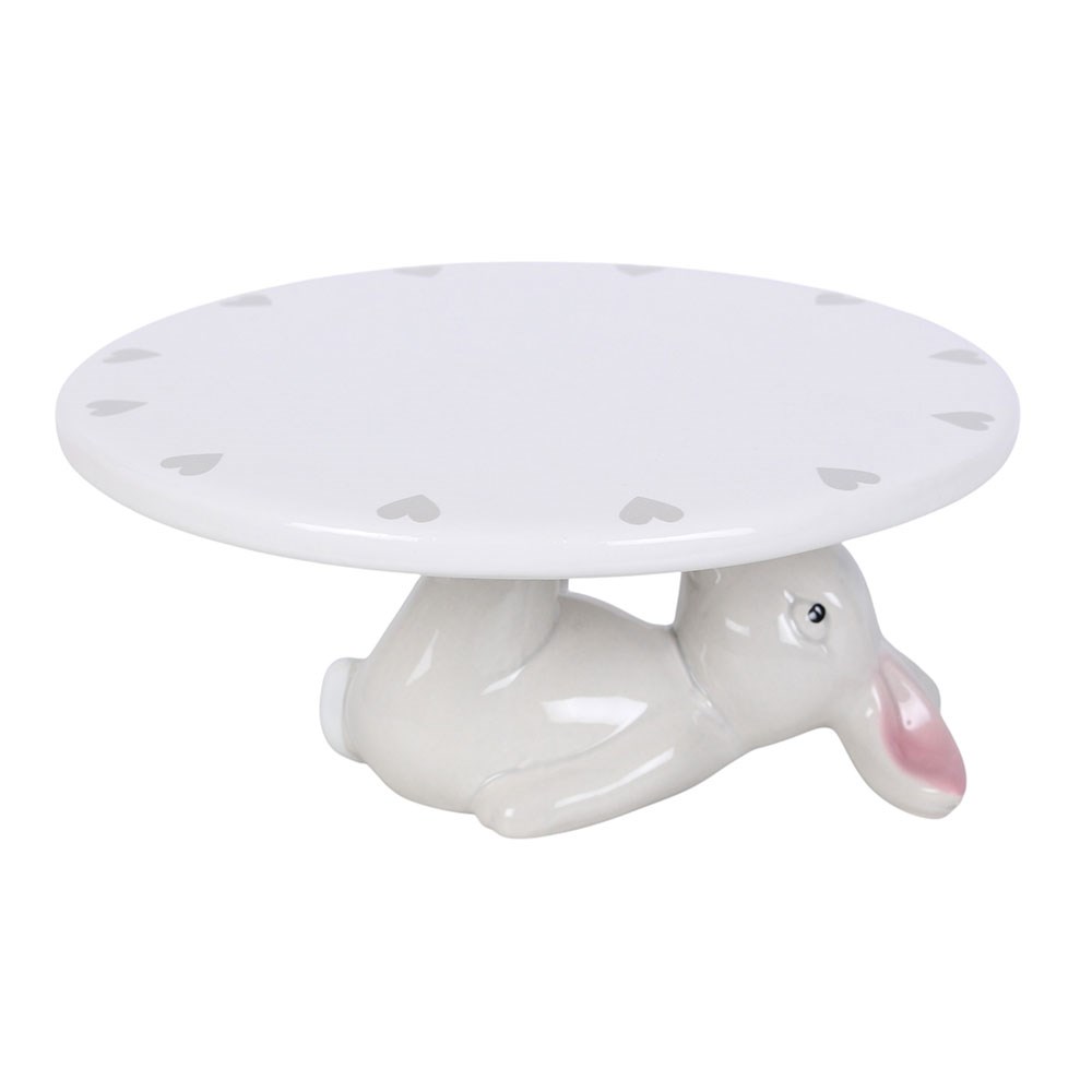 Add a dash of humour to your display with this charming bunny rabbit cake stand. Crafted from ceramic, the playful bunny lies on its back with a partially painted finish, holding the 6 inch cake plate aloft with its feet for a fun and eye catching effect. The plate is decorated with delicate grey hearts painted in a circle around the edge, adding a sweet decorative touch. Measuring approximately 17cm, it is ideal for showcasing cakes, cupcakes, pastries or party treats. A delightful centrepiece for Easter celebrations, spring gatherings or afternoon tea, and a lovely gift idea for bakers and rabbit lovers who enjoy something a little different for their table.