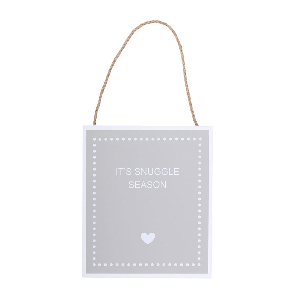 Add a cosy touch to your home with this rustic grey hanging sign. Made from MDF in a soft grey shade, it features the wording It s Snuggle Season finished with a sweet white heart detail for extra charm. Complete with a rope hanger at the top, it s easy to display on doors, walls or hooks around the home. With its shabby chic style, it s perfect for autumn and winter d cor or as a thoughtful gift for anyone who loves those snug evenings in.